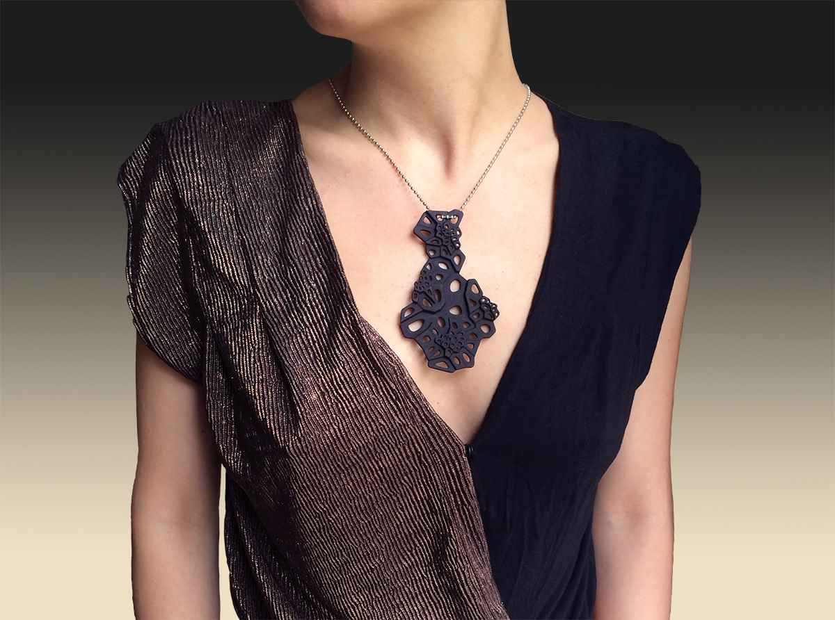 This design is based on a 3d dantelle study. Dantelle, also known as lace in English, is a type of hand made fabric with holes. In this necklace, this traditional hand craft is converted into a 3d object with a terrain like surface.
