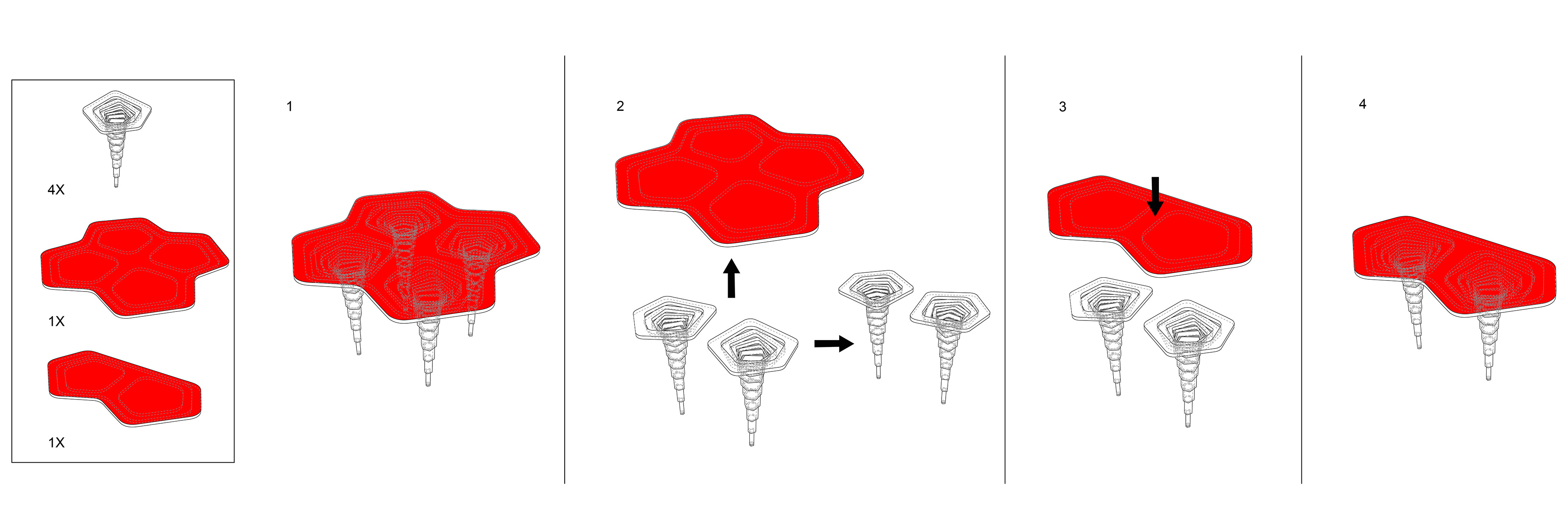 This table is inspired by the dripstone caves, which consists of a limestone formation called stalactite. These structures hang from the ceilings of the caves. They are created by dripping mineral waters of the cave. This water leaves its minerals behind in a circular shape as it descends towards the floor of the cave. Therefore, these structures represent the vertical movement of the mineral water as a result of the gravity force. Inspired by the stalactite structures, the Dripping Table is made of legs, which are descending from the top of the table into the floor. The continuity and elegancy of this table is a result of the emergence process of this continuous and elegant movement as it is in the dripstone caves. The Dripping Table is made of at least two or more legs. The two-leg type is mounted on the wall. The rest of the types are free standing. The top plate of the table holds the legs together. Consequently, users can change the sizes of their tables in the future by buying a new top plate with additional legs. The Dripping Table combines the logic of manufacturing with the logic of form. This way, it accomplishes to waste minimum material during its manufacturing. It is made of several cut outs from the top plate. These cutouts are gradually rotated and attached each other using intersecting faces. Consequently, the table rises until the height needed and creates an elegant integrated spiral movement.